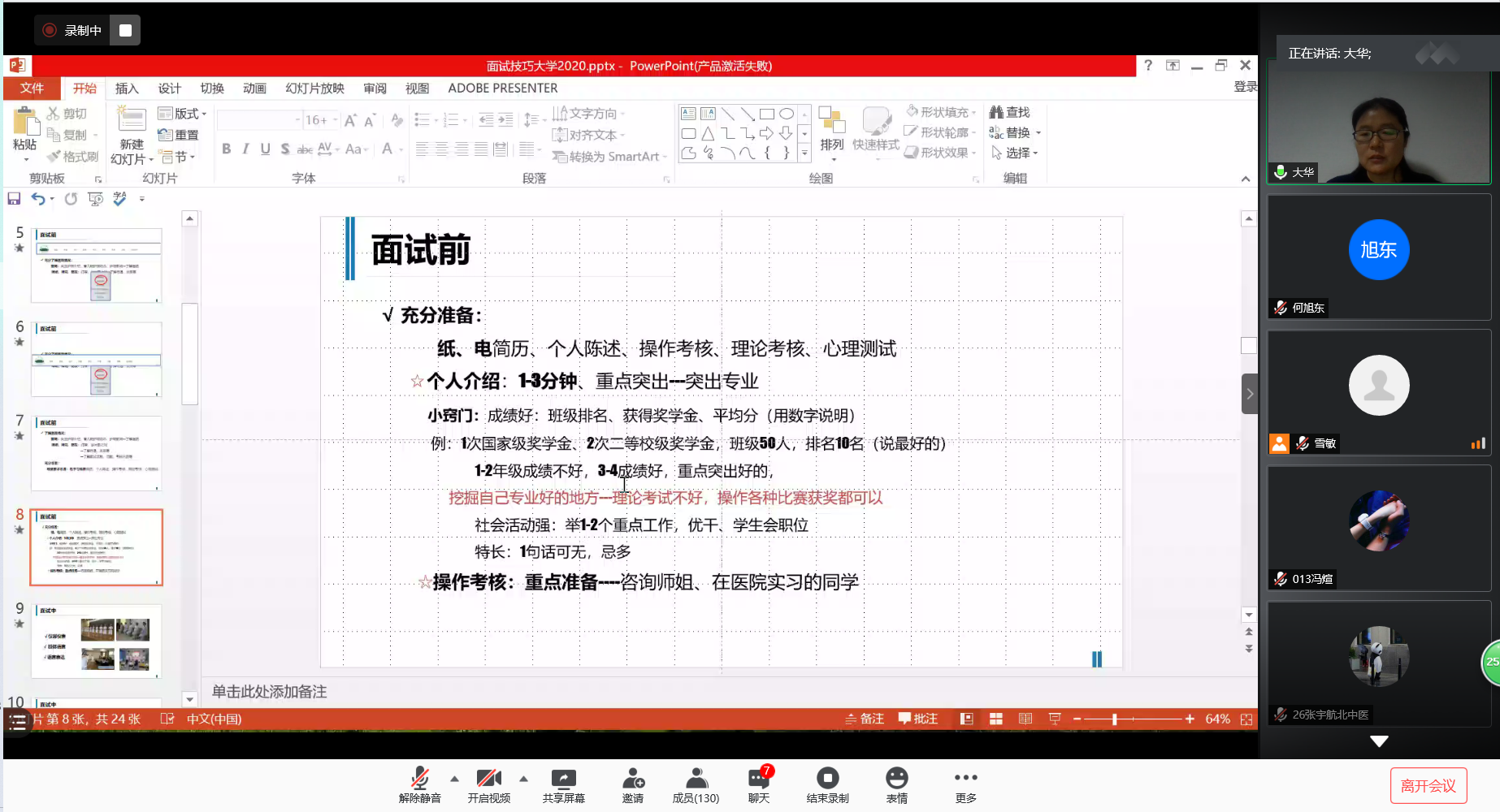 受新冠疫情影响和招生规模扩大双重压力,必赢bwin官网护理学专业2021届毕业生就业形势严峻,为帮助同学们掌握面试技巧,提高面试成功率,11月3日晚,学院面向2021届毕业生举办线上面试技巧专题培训。培训邀请必赢bwin线路检测中心官网第三附属医院护理部主任张大华老师作为主讲,她立足岗位胜任力,结合护理专业特点,进行针对性指导,主要内容围绕面试环节与面试技巧展开,2021届本科、硕士研究生共180余人参加讲座。